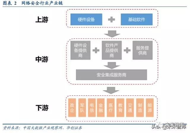 从产业链来看,网络安全行业的上游主要为工控机、服务器、存储器、芯片及操作系统、数据库等软硬件厂商。产 业链上游市场竞争充分,主要参与者均为成熟的全球化厂商,产品更新快,产量充足,产品价格相对稳定,且产品 性价比呈上升趋势。中游为提供安全产品、安全服务、安全集成的厂商,下游则是政府、金融、电信、能源等各行 业的企业级用户。