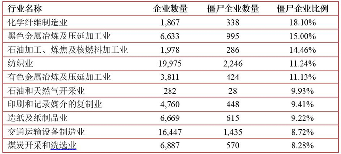 表1:僵尸企业比例最高的十个制造业行业。