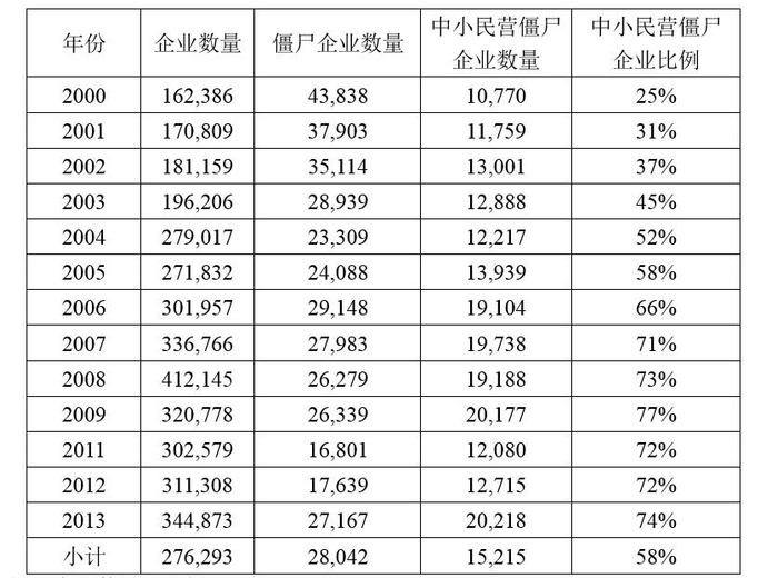表2:僵尸企业数量和比例。来源:方明月等(2018)