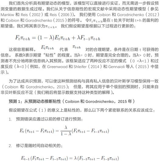 在其方法论上,我们的论文还与关于期望形成的最新宏观文献有关。我们使用的动态性期望模型在Coibion和Gorodnichenko(2012)中进行了分析,该模型最初应用于专业的预测。在Mankiw和Reis(2001)中,由于固定成本,代理也很少更新信念,这反过来又导致了粘性价格。本文的其余部分安排如下:下一部分列出了Coibion和Gorodnichenko(2012)的模型,并将其适应于公司层面特征的环境,并具有对未来盈利的预测能力。我们得出结构预测,这些预测将这些公司层面特征的持久性和预测能力,分析师的信念粘性水平以及其预测误差的动态联系在一起。第三节介绍了数据。第四节收集了我们的经验结果:首先,我们通过预测形成时可观察到的几种特征来记录收益,收益和预测误差的可预测性。其次,我们测试模型的结构预测。第五节使用蒙特卡洛模拟来检验结果的稳健性,最后第六节得出结论。