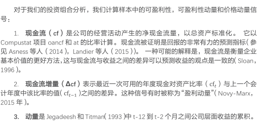 我们假定会计数据在记录收益公告后可用,该数据我们从Compustat季度获得。会计利润率信号在公司定额年度收益公告后的下个月更新,并且一直有效到公司下一个定额年度收益公告的月份。因此,我们要求有两个连续的年度收入公告。