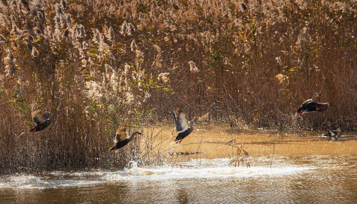 这儿更是鸟儿徙线路上的重要驿站,芦花乘着风,捎来候鸟的问候。层层叠叠的如浪般翻滚宛如掉入人间的云朵,随风飘舞。成片的芦苇荡,白芦花、黄芦杆,水鸟隐匿在芦苇丛中,偶尔一声脆鸣冲上云天。