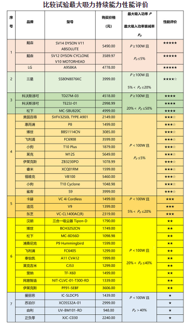 在最大吸力持续能力方面,部分产品电池性能衰减明显。35款样品中,部分表现优异的产品,其吸力可以保持到运行结束。但仍有很多产品并未对产品的吸力衰减进行有效限制,影响实际使用效果。其中,爱丽思、苏泊尔、由利、正负零四个品牌的最大吸入功率小于100w,同时最大吸入功率衰减率大于40%,性能评价并列排在最后。
