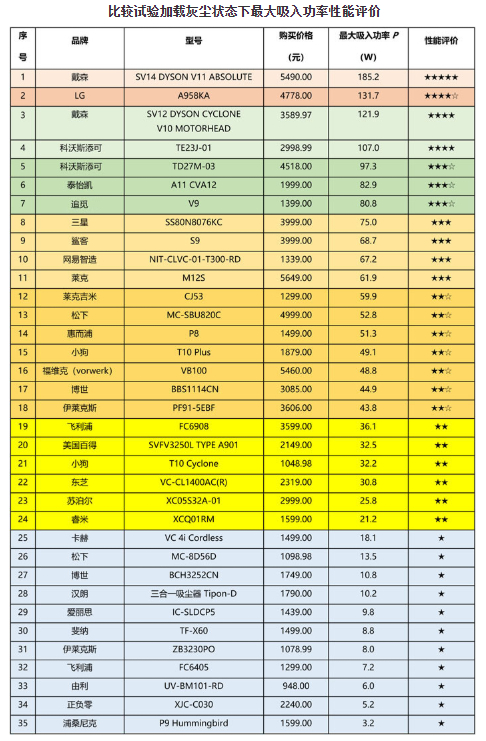 在加载灰尘状态下最大吸入功率方面,大部分被测产品的最大吸力出现不同程度的衰减。其中,一款价格为5490元的戴森产品最大吸入功率排在首位,而一款价格为1599元的浦桑尼克产品,最大吸入功率仅为3.2w,最大吸入功率性能最差。