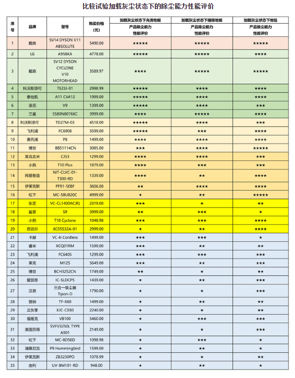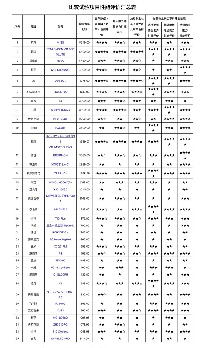 本次比较试验样品从京东、苏宁等电商平台购买,涉及28个品牌,35个型号,包括戴森、LG、东芝、飞利浦等主流品牌,购买价格从5649元/台到948元/台不等。