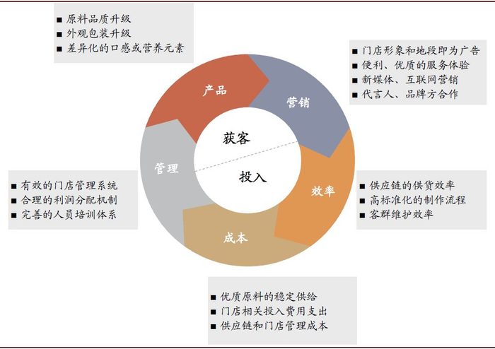 我们总结了现饮门店成功运营的五力模型,认为企业必须同时在五个方面(产品、营销、效率、成本、管理)有所投入以维持可持续的品牌发展和门店盈利。不少品牌或因某一要素(如营销、产品)而红极一时,若不能持续投入以改善自身短板,则无法保持长久的市场竞争力而面临客源流失和亏损。我们看好能同时兼顾获客和品牌软实力提升的品牌,看好有品牌明显优势同时没有明显实力短板的品牌。