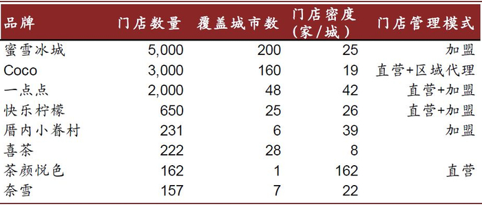 从发展历程与行业现状看,现制茶饮行业整体呈粗放性发展,头部品牌的分布格局与创立时间、直营/加盟模式的选择密切相关,准入门槛低、同质化水平高等因素导致市场高度分散,行业处于高速发展期;现磨咖啡行业格局初现,分层竞争将推升行业集中度。