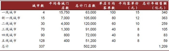 资料来源:大众点评,中金公司研究部推算 注:城市分级采用第一财经新一线城市研究所分类;平均客单价不含店售糕点、轻食等