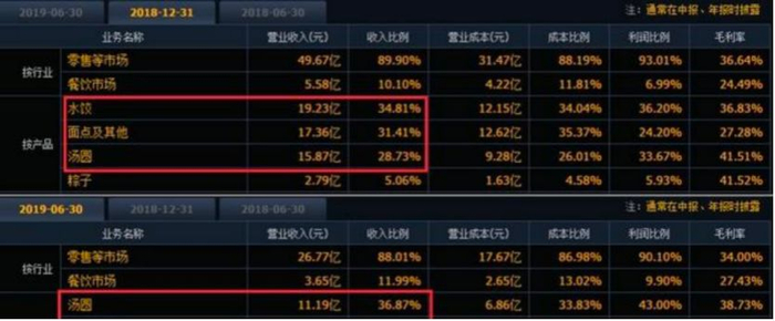 2018年,其水饺、汤圆营收分别为19.23亿和15.87亿元,分别占整体营收的34.81%和28.73%。根据2019年半年报,速冻水饺占营业收入比重在今年上半年首次低于汤圆业务和面点及其他业务。数据显示,报告期内汤圆、面点及其他、水饺业务占营业收入比重分别为36.87%、30.03%和24.90%。