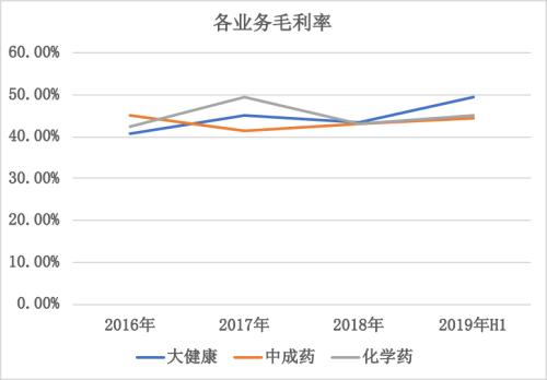 大健康业务及大南药业务的毛利率在2016-19年H1均维持的40%-50%附近,受惠王老吉提价,大健康业务毛利率上升至49.58%;而中成药及化学药虽各有缺点,但赚钱能力依然比较强劲。