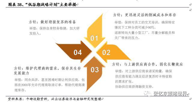 卡特彼勒已经成为制定“低谷期战略计划”并且随后应对经济衰退的范本,能够在不损害复苏前景的前提下迅速调节产量、降低成本。2005年,吉姆·欧文斯制定了“低谷计划”,作为一家典型经济敏感型行业,卡特彼勒表现出优秀的针对市场变化进行有效调整的能力,其管理智慧体现在: