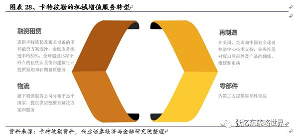 同时,经历了经济总量结构性调整后,卡特彼勒避免采取上游垂直整合的策略,为了缓和经济周期对公司盈利的影响,公司开始重视增值服务转型,为客户提供涵盖了产品、技术和服务的完整产业链条,包括产品设计、机械设备制造、零配件服务、物流服务、供应链、金融服务、再制造服务等的整体解决方案。