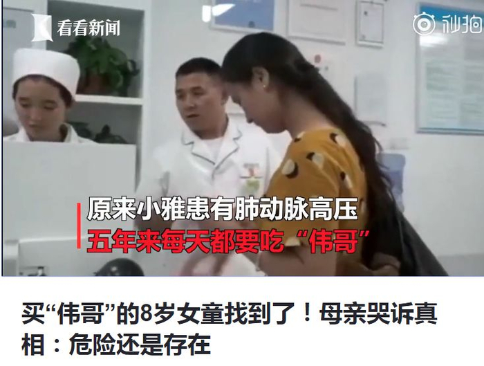 用“伟哥”治疗肺动脉高压,在患者之间早已不是秘密。今年9月,一则名为《买伟哥的小女孩》的视频流传于网络,河南许昌的8岁女孩小雅自己一个人跑到药店,要求买“伟哥”,而且一买就是十盒。药剂师在询问之下,小女孩的妈妈只好忍住眼泪解释,女儿是肺动脉高压患者,吃伟哥能救命。