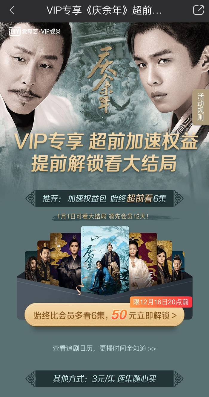 爱奇艺APP上《庆余年》VIP专享付费超前点播活动规则也与腾讯视频差不多,即在相同的时间段内,VIP会员50元购买解锁超前加速包,将享受在会员更新集数基础上,每个更新日比会员多看6集的权益。并且,爱奇艺在规定时间段内也支持单集付费,定价3元/集。