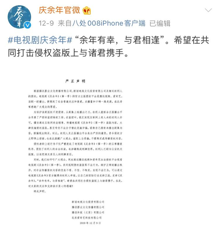不过,《国际金融报》记者同时注意到,就在“超前点播”前夕,电视剧《庆余年》官方微博曾发布声明称,在监控维权过程中,发现有人擅自通过互联网非法销售、传播电视剧盗版内容,甚至有不法分子借此实施诈骗,谎称自己拥有未播出剧集内容,诱骗观众购买。对此,权利人及正版播出平台表示严厉谴责,责令侵权方立即停止侵害,同时也呼吁网友通过正规平台观看,共同抵制侵权盗版等不法行为,维护正常播出秩序,支持正版。