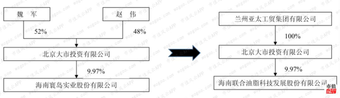 2009年4月3日,魏军、赵伟与兰州亚太工贸集团有限公司(以下简称“兰州亚太集团”)签订股权转让协议,后者分别受让魏、赵所持有的北京大市的52%、48%股权。交易价格1块钱,但是,兰州亚太集团需代魏、赵两人偿还欠上市公司的1.3175亿元债务(此前购买棕榈油的货款)。