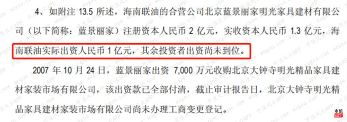 2007年9月,上市公司分两次对北京蓝景丽家明光家具建材有限公司(以下简称“蓝景丽家”)投资共计1亿元,投资完成后,上市公司持有蓝景明光50%股权。
