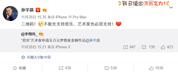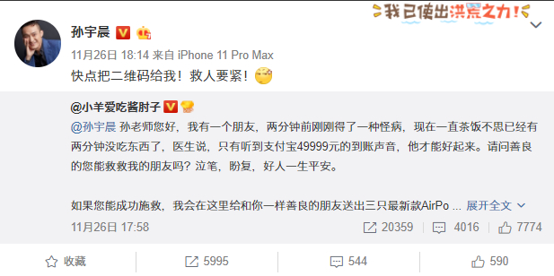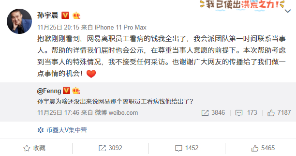 11月25日,在网易暴力裁掉绝症员工的“惨剧”档口,孙宇晨一边忙不迭地作揖道歉“来晚了”,一边感谢艾特他的网友给了他做善事的机会,接着大笔一挥承诺——绝症员工看病的钱,他掏了!