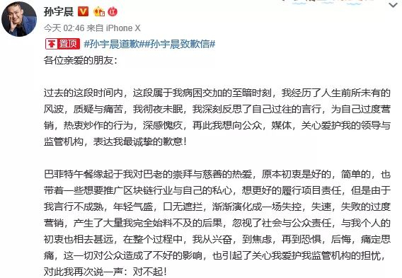 7月25日,孙宇晨发布了一封致歉信,向公众、媒体与监管机构等致歉,并称巴菲特午餐缘起于其对巴菲特的崇拜与慈善的热爱,但是由于其言行不成熟、年轻气盛、口无遮拦,渐渐演化成一场失控、失速、失败的过度营销。