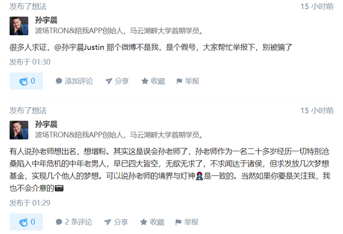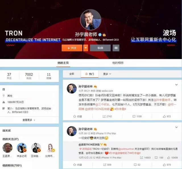 波场TRON区块链官方微博则回应称,“我们与微博有直接的沟通管道,会尽快沟通解决”。同时公布了孙宇晨新的微博账号。