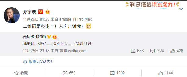 一波高潮迭起的网络狂欢中,孙宇晨不断送出2019年底最“温暖”的一句话:二维码给我!
