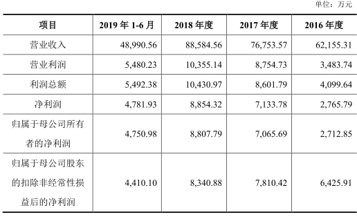 新大正最新招股书显示,2016年至2019年1-6月,公司实现营业收入分别为6.22亿元、7.68亿元、8.86亿元、4.90亿元;归属于母公司所有者的净利润分别为2712.85万元、7065.69万元、8807.79万元、4750.98万元;经营活动产生的现金流量净额分别为6609.39万元、8040.37万元、1.14亿元、-4131.61万元,其中销售商品、提供劳务收到的现金分别为6.32亿元、7.95亿元、9.39亿元、4.53亿元。
