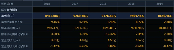 梳理历史财务数据,公告显示,2018年内实现营收4.81亿元,同比下滑1.12%;归属于上市公司股东的净利润8413.08万元,同比下滑9.15%;基本每股收益为0.41元,同比下滑8.89%。