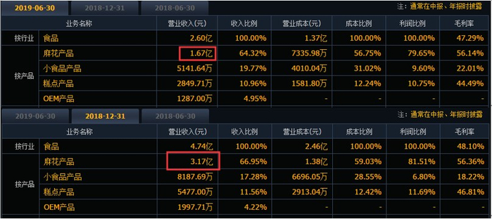 但到2018年和2019年上半年,麻花的收入占营业收入的比例分别为66.95%和64.32%。