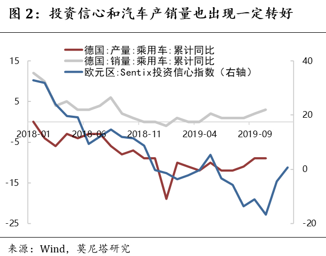 近期欧洲经济数据呈现出良好走势,制造业PMI已经连续2个月明显回升。分国家看,无论是德、法等主要国家,还是债务情况最差的“欧猪五国”(葡萄牙由于没有PMI数据,因此未计算在此合成指数内),经济景气均出现一定的修复(图1)。此外,投资信心指数、汽车产销量等数据也出现了一定程度的转好(图2)。这与前期英国脱欧陷入僵局的情势,以及欧洲经济即将步入衰退的观点相左。