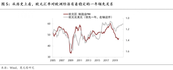 从历史数据看,欧元汇率对欧洲经济有着非常稳定的领先性,领先时间在1年左右(图5)。2016年,英国脱欧公投,欧元汇率急跌,随后的2017年欧洲经济景气明显改善;2017年,欧洲经济表现稳健,加之受特朗普刚刚就任频频受挫,美元指数一度走弱的影响,欧元汇率一路稳中有升,随后的2018年欧洲经济重陷低迷;2018年,欧元兑美元汇率从1.23的高点下跌到年末的1.14,但随后的2019年受到英国脱欧与贸易不确定性的影响,欧洲经济继续下行;2019年至今欧元又从1.14下跌到1.10,目前汇率已经处于非常低的位置,考虑到脱欧与贸易的不确定性大大减小,预计汇率对经济的提振作用将很快显现。简单回归可知,目前的汇率水平大致会使2020年的欧元区制造业PMI上升到55左右。