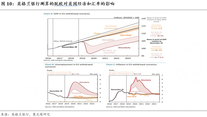 如果如我们所预计的欧洲经济最差的时候已经过去,由于欧洲经济外向型、弹性高的特点,再加上低基数效应,2019年的“美强欧弱”将转为2020年的“欧强美弱”,而这大概率会给美元指数带来拖累,因为从历史上看,美元指数与美欧经济之差是非常明显的正相关关系(图9)。根据英格兰银行的测算,如果英国最终顺利协议脱欧,根据脱欧后与欧盟关系的紧密程度不同,英镑将会在2018年11月的基础上升值2%-5%(图10),也就是相比较2019年12月9日的点位上升1%-4%。欧元上升幅度稍小,弹性大概是英镑的1/3,因此欧元上升幅度大致在0.33%-1.33%之间。在美元指数中,欧元占比57.6%,英镑占比11.9%,因此如果只考虑英国顺利脱欧带来的英镑和欧元上涨,将大致使得美元指数下跌0.6%-2.4%左右;当然如果再考虑到欧洲经济最差时候已过,美元指数下跌幅度可能更大。