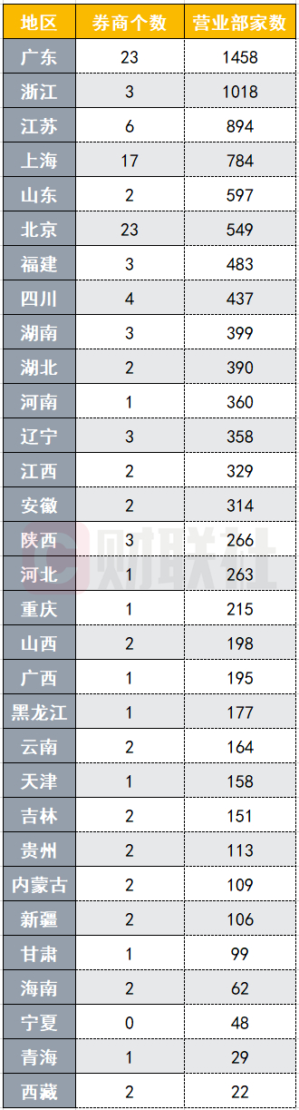 根据choice数据,现在国内共有证券营业部10745家,其中又以广东和浙江分布最多,分别为1458家和1018家。