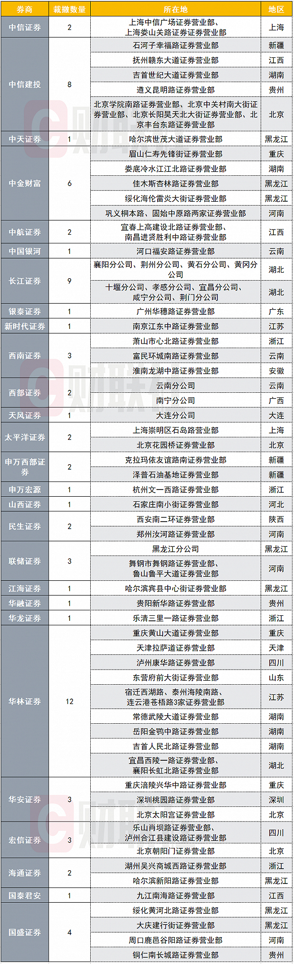 从各券商撤销营业部的情况来看,广州证券撤销分支机构的数量最多,由于被中信证券收购,广州证券全国范围内撤销了28个包括分公司、营业部在内的分支机构。其次,华林证券和东北证券同样撤销了12个分支机构并列第二位,中信建投撤销了8个分支机构位列第三。