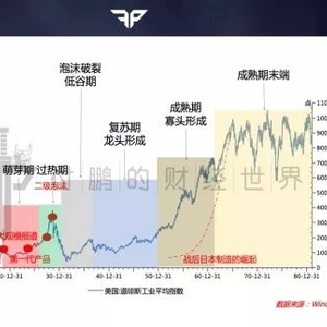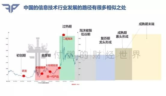 很多人从微观、宏观角度去解释1929年美国股灾,但从产业生命周期角度看,1929年股灾是躲不过的一劫,它跟2000年互联网泡沫及中国IT行业发展路径极为相似(如下图)。在产业生命初期都要经历一轮泡沫,之后泡沫出清,逐步形成龙头和寡头,最后企业利润增长放缓,股价进入成熟期末端的震荡。