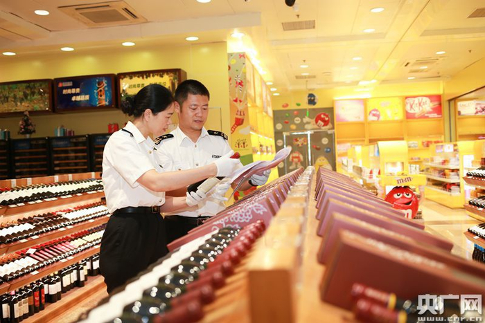 拱北海关关员在拱北口岸免税店巡查(央广网发 通讯员供图)