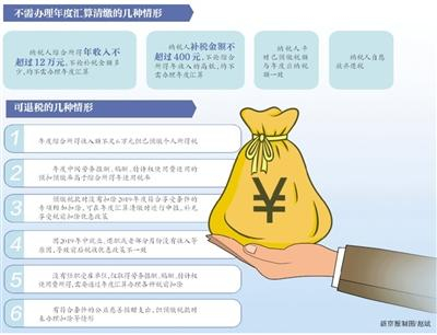 征求意见稿明确,需要补税但年综合所得不超过12万元或者补税金额不超过400元的,以及预缴税额与年度应纳税额一致或不申请年度汇算退税的,不需办理年度汇算清缴。