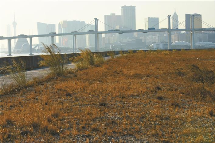 从填海而成的澳门新城A区土地上远看澳门城区(11月21日摄)。新华社记者 徐亮 摄