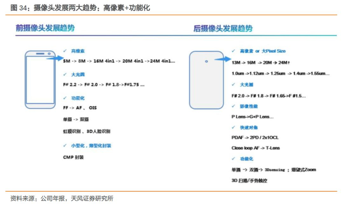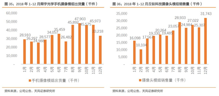 像素提升:2018年,公司摄像头模组总出货量为5.51亿颗,其中1300万像素摄像(含)及以上出货量占比达到50%以上;丘钛摄像头模组总出货量为2.64亿颗,其中1000万像素及以上摄像头模组出货量占比约43.5%。舜宇已开始量产4800万像素手机镜头和3200万像素超小头部手机镜头,同时公司技术水平目前已达到6400万像素级别,如2019年发布的Redmi Note 8 Pro摄像头模组由公司和舜宇供应,其中首发的6400万像素摄像头模组由公司独家供应。