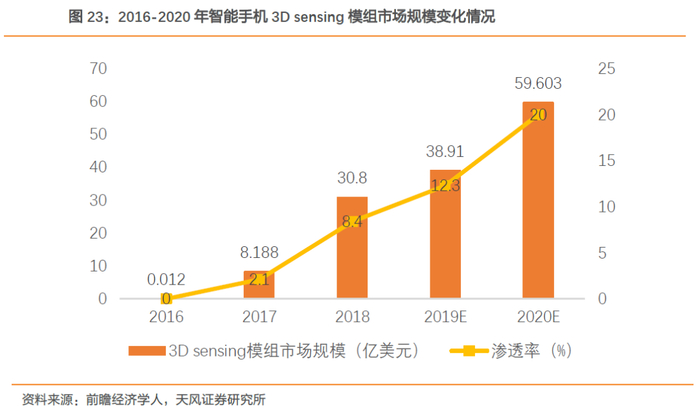 大厂示范效应下,3D sensing加速渗透,预计2020年市场规模达到59.6亿。2017年,苹果推出搭载前置3D sensing摄像头的iPhone X机型,正式开启智能手机3D sensing时代;预计苹果2020年推出iphone、ipad pro将搭载3D ToF模块。大厂示范效应下,2020年手机市场将掀起3D摄像浪潮,加快3D sensing渗透速度,预计2020年15%-20%的手机有望搭载ToF摄像头,3D sensing市场规模接近60亿美元,渗透率达到20%。