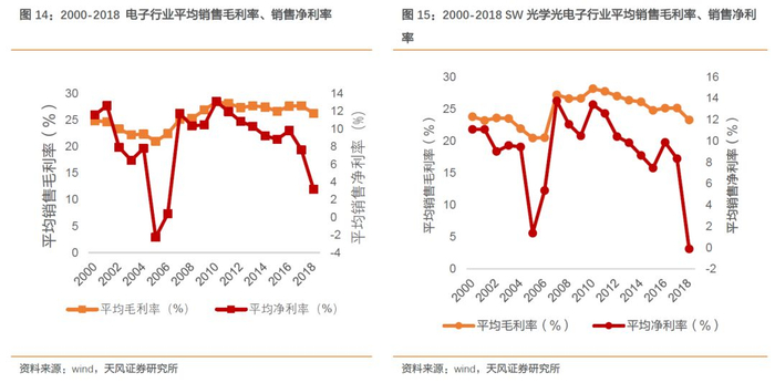 从电子及细分板块行业看:行业整体盈利能力已经触底,预计将出现回暖迹象。采用SW电子板块/SW电子细分板块下所有上市公司2000-2018年销售毛利率、销售净利率数据,并通过去除最大最小值求取平均值来反映电子行业/电子各细分行业整体波动趋势(AB股共存的公司剔除B股)。从电子行业整体来看:2000-2018,电子行业平均销售毛利率处于20%-30%之间,波动平稳;平均销售净利率基本处于7-12%,其中2005年、2018年达到阶段低谷,分别为-2.26%、3.15%。整体来看,2018年电子行业盈利能力与2007年处于相同水平,重回周期底部,2019H1电子行业销售净利率达到5.20%,盈利能力提升的迹象已经出现。从SW光学光电子行业来看:2007年后,SW光学光电子细分板块销售毛利率位于20-30%区间内,波动平稳;销售净利率位于8-14%区间内,波动较大,其中2018年达到低谷-0.11%,与2005年处于相同盈利水平。回顾2005年SW光学光电子细分板块发展趋势,2018年行业盈利能力已经触底,预计未来将开始复苏。