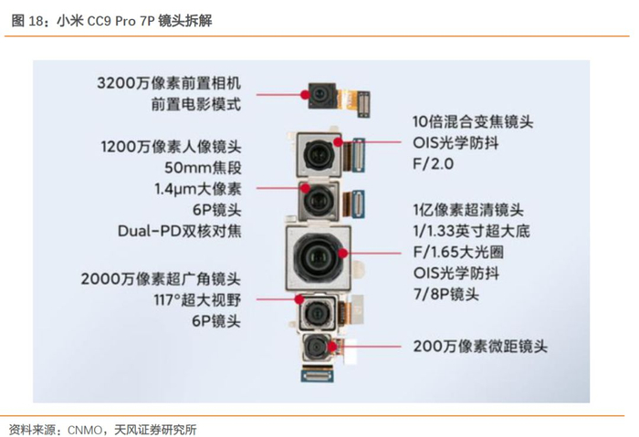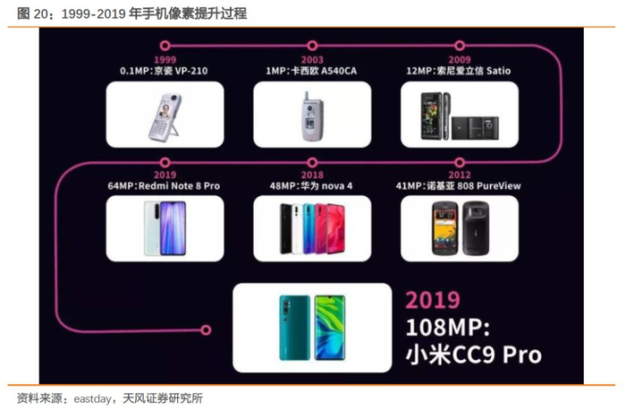 高像素:1999年,三星SCH-V200和京瓷VP-210手机摄像头像素为0.1MP;2019年,新发布的Redmi Note 8 Pro和小米CC9 Pro手机摄像头像素达到1.08亿;20年间,手机摄像头解析度从最初10万提升到1亿,未来216M像素的开发已经进入议程之中。手机像素的提升将增加图像处理方式的灵活性:弱光时,通过超采样或者集中读取,高像素传感器可以达到低像素传感器一样的信噪比;强光时,高像素传感器使用全像素输出可以比低像素传感器采集到更多高频细节。