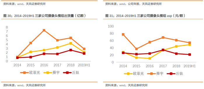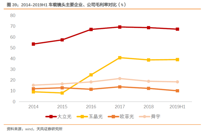 毛利率方面:2014-2019H1整体来看,公司毛利率在11%上下波动,(舜宇9%波动、丘钛8%波动),2019H1,公司摄像头模组业务毛利率为9.18%,同比下降5.98%,下滑主要由产品结构引起,单摄模组出货量增长高于多摄模组出货量增长。未来随多摄渗透率提升,公司毛利率存在一定提升空间。