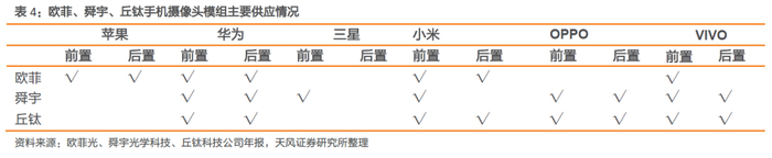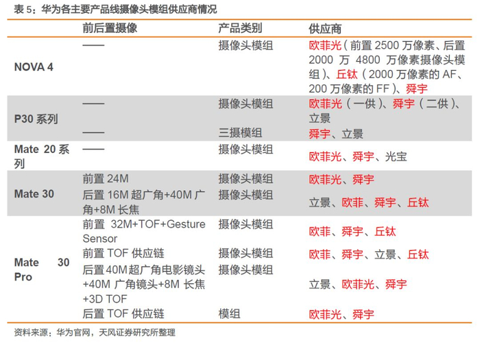 华为:欧菲光、舜宇高低端产品线全覆盖,丘钛高端产品线渗透较低。Nova系列:Nova3和Nova 4摄像头模组均由欧菲、丘钛、舜宇三家供应;P系列:P30摄像头模组供应商中公司为一供,舜宇为二供;三摄模组由舜宇、立景供应,丘钛未参与;Mate系列:公司与舜宇全面覆盖Mate 20、Mate 30、Mate 30 Pro摄像头模组供应,但丘钛主要供应Mate 30后置、Mate 30 Pro前置摄像头模组。相比丘钛,公司华为高端产品线渗透率较高。