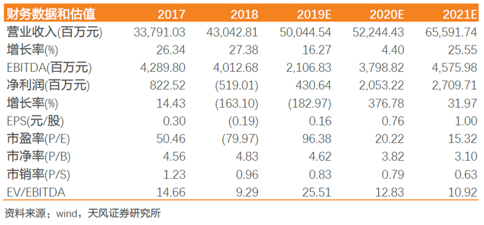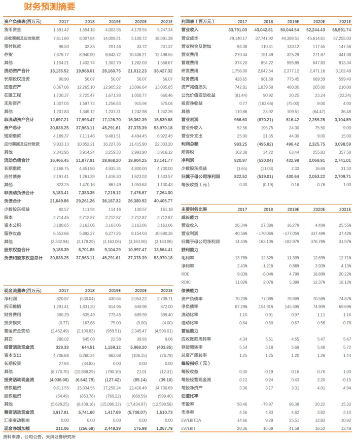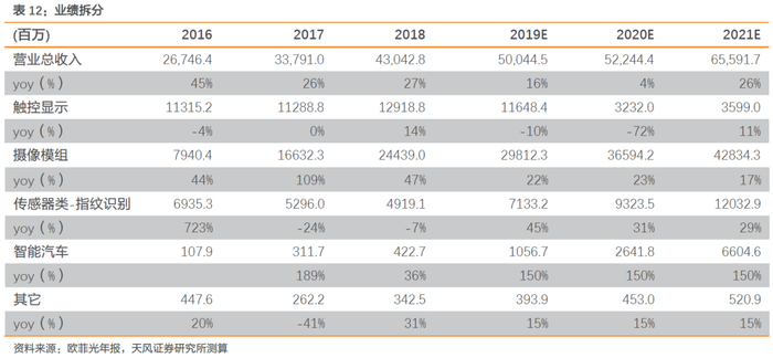 公司为国内光学龙头,整顿后经营重回正常轨道;股权转让+国资入股,公司缓解资金压力;触控出表,聚焦光学主业;展望未来,β+α逻辑下公司业绩弹性大。摄像头板块:β:行业修复+产能紧缺+客户进入“超级周期”+光学持续升级+应用场景拓宽;α:景气向上开工率提升+上延镜头,收入段盈利端持续向好。指纹识别:为稀缺光学屏下指纹模组厂商,持续受益屏下指纹渗透增速提升;此外公司进入汽车电子蓝海市场,应用品类拓展保证中长期成长。在考虑公司出售非苹果触控显示资产的情况下,给予19-21年营收为500.45、522.44和655.92亿元,净利润预计为4.31、20.53和27.10亿元;估值方面,我们选取消费电子产业链龙头(立讯-整机模组,歌尔-声学)以及A股光学公司进行对比,2020年可比公司均值为32x,且消费消费电子产业链龙头2020年估值在35x以上,公司身为国内光学龙头稀缺标的,因此我们给予公司2020年35倍PE,目标价26.6元,维持“买入”评级。