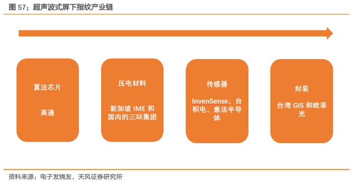 超声波式屏下指纹:仅有公司和GIS实现量产。超声波指纹识别方案产业链主要分为算法芯片、压电材料、传感器及封装三部分:高通成为算法芯片领域里唯一一个已经实现方案商用的企业,封装领域中高用主要合作商仅有台湾GIS和欧菲光。