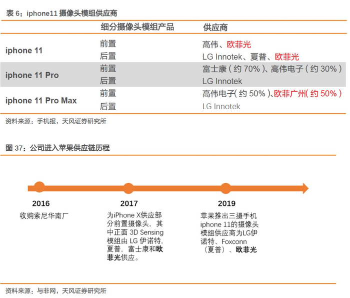 苹果:国内摄像头模组行业内,公司一枝独秀。2016年底,公司通过收购索尼华南厂切入苹果摄像头模组供应链中;2017年,欧菲影像技术有限公司广州工厂向iphone X供应部分前置摄像头模组;2018年,公司向苹果供应前置面部识别(Face ID)功能所需的红外线摄像头模组;2019年,苹果推出iphone 11的三摄摄像头模组供应商为LG伊诺特、Foxconn(夏普)、欧菲光。