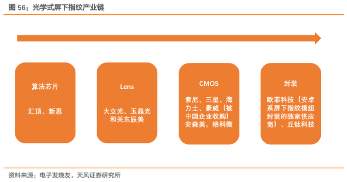 光学式屏下指纹:仅有公司和丘钛满足大规模量产需求。光学指纹识别方案产业链主要分为算法及芯片、CMOS(将光信号转为电信号)、Lens(微透镜阵列)、滤光片及产品封装四部分,其中封装部分主要企业为公司和丘钛科技。