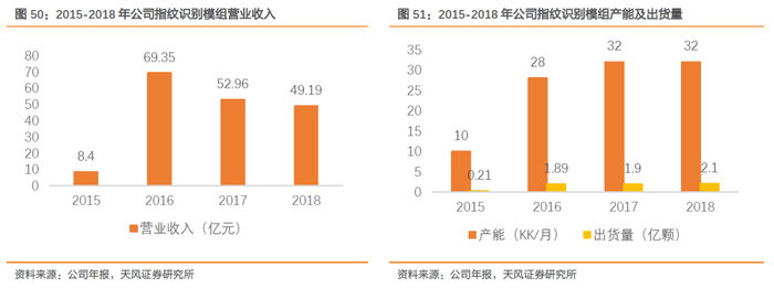 坚定产品结构转型,安卓系屏下指纹模组封装稀缺供应商。公司2015年5月开始量产指纹识别模组。2015-2018年,公司指纹识别模组营业收入从8.4亿元增长至49.19亿元,产能由10KK/月增长至32KK/月,出货量由0.21亿颗增长至2.1亿颗,其中2018年营收较2017年下滑是因为传统电容式指纹识别模组技术成熟,市场竞争加剧导致产品价格下滑。2015-2018年,公司产品ASP由40元/颗下滑至23.42元/颗,坚定公司产品结构转型决心,加大对屏下指纹研发投入,公司2018年32KK/月的产能中电容式指纹产能为25KK/月,屏下指纹产能已达到8KK/月,率先成为光学式、超声波式两种屏下指纹技术方案皆具量产功能的供应商。目前,公司技术优势已经凸显,在成为传统的电容式指纹识别模组主力供应商后,再度成为安卓系屏下指纹模组封装稀缺供应商。