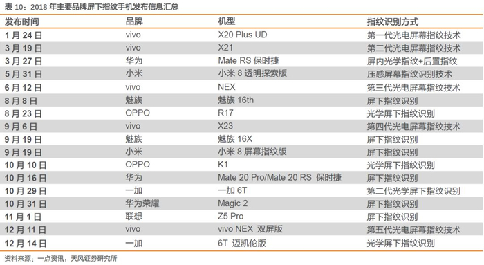 量的上升动力:全面屏趋势。 2018年是全面屏的元年,也是屏下指纹渗透率全面提升的一年。在全面屏下,手机正面没有足够空间放置传统的电容指纹传感器,屏下指纹成为全面屏手机指纹识别的主流方案,各大智能手机厂商积极迈入全面屏+屏下指纹时代,2018年全年共计约20款旗舰机搭载屏下指纹识别方案,其中vivo一共推出五代光电屏幕指纹技术,侧面反映光学式屏下指纹识别技术成熟度的高速发展。全面屏未来将向中高端机型下沉,渗透率继续提升,据CINNO Research预计,全面屏在智能手机市场渗透率2021年将达到93%,进而带动屏下指纹应用空间全面打开。
