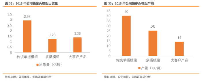 产品高端化趋势驱动量价双升。量: 2018年以后,全球重点手机品牌大幅拓展双摄像头,从旗舰机型到中低端机型持续渗透,双摄模组渗透率远超预期,全国在售手机后置双摄占比已达64%,全球智能手机摄像头总数达到41.5亿颗,平均每部手机搭载摄像头颗数达2.84颗;预计2019年单部手机平均摄像头将会突破3颗,三摄市场渗透率迅猛提升。价:以公司产品asp为例,2018年公司单摄像头asp为28.60元,多摄像头asp为83.33元,将近单摄像头asp的三倍。作为摄像头模组龙头企业,多摄模组量价双升驱动公司摄像头模组业务营收稳健增长。